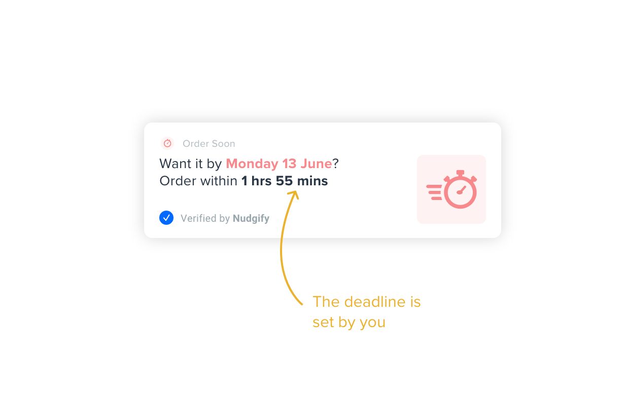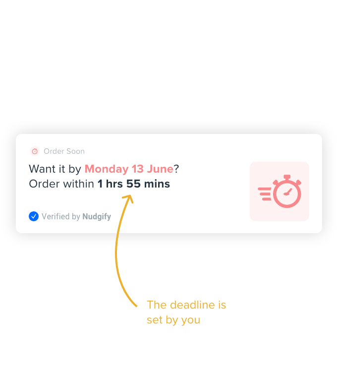 An Order Soon Nudge increases your conversion rate by giving your visitors a reason to click “Buy” immediately. Placed on your product pages, it shows a “want it delivered by …” deadline.