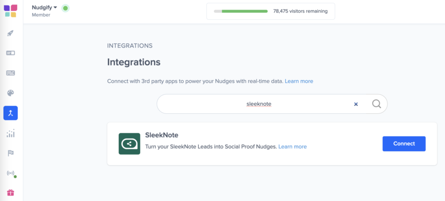 - Copy Your Webhook URL: Access the integration settings in your Nudgify account to find the Sleeknote integration and click “Connect” to obtain your Nudgify Webhook URL.