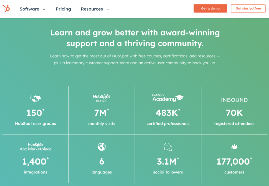 HubSpot features impressive customer data, including the number of businesses they’ve helped grow (over 100,000) and the total number of monthly website visits powered by their platform (over 15 billion). These statistics highlight the broad reach and effectiveness of HubSpot’s marketing tools.