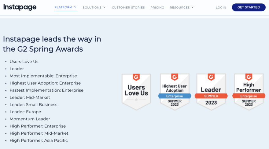 Another SaaS example is InstaPage, which prominently displays numerous industry awards and badges on the landing page for their marketing automation service: