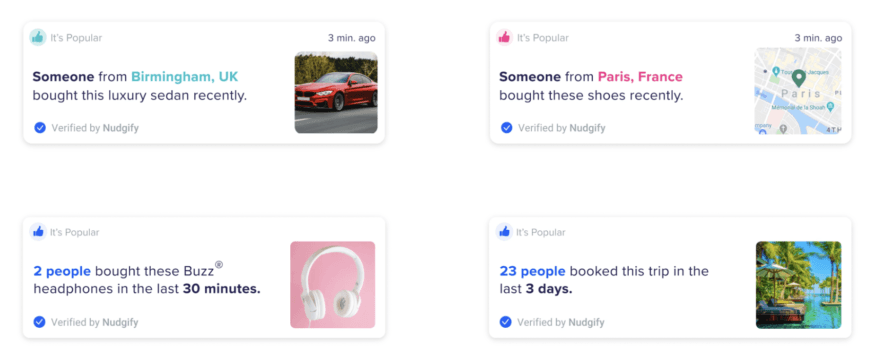 - Recent Purchases: Showcasing a notification that highlights recent purchases made by customers can create a sense of urgency and FOMO (fear of missing out). Seeing that others are buying your products or services can motivate potential customers to make a purchase as well.