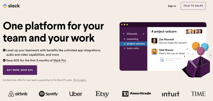 Another popular example of using client logos as social proof on landing pages is demonstrated by Slack, a leading team communication platform: