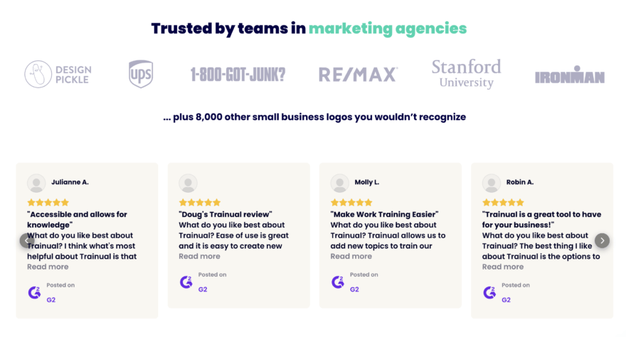 For example, Trainual have embed third-party reviews from G2 directly within their SaaS landing page: