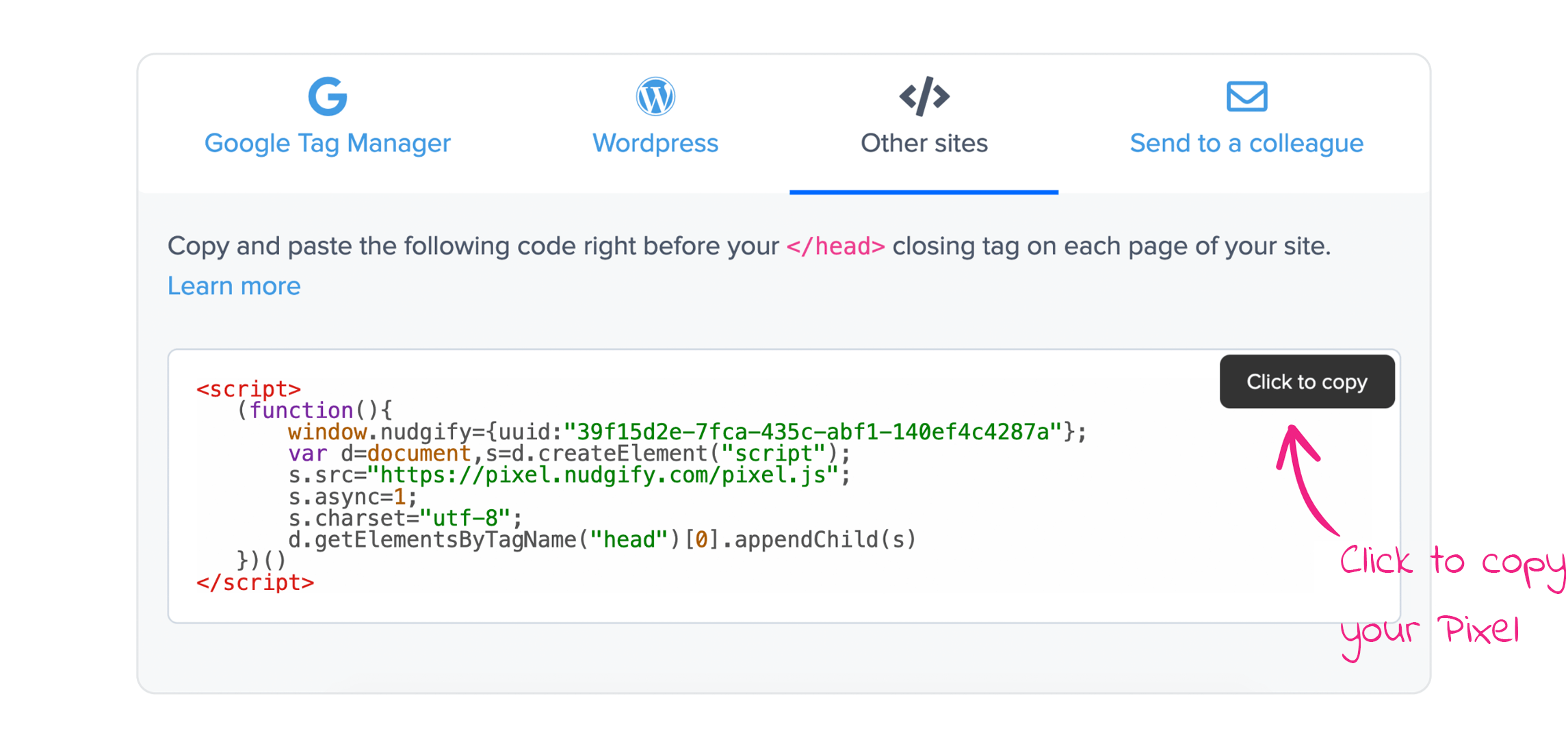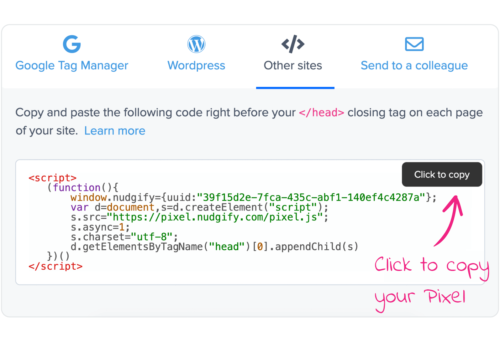 You get your own unique Pixel when you sign up, all you have to do is copy-and-paste it.