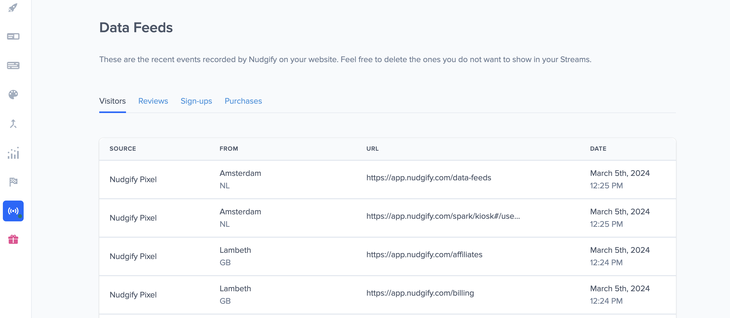 Good news! You can now view your visitors data on your nudgify account. On your datafeed tab, you can view all the visitors that have accessed your site.